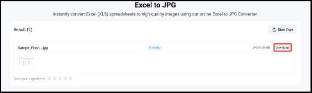 iii) As soon as you press the Convert button, the tool converts your Excel file into a JPG in the blink of an eye. Simply, click on the “Download” button to save the JPG.