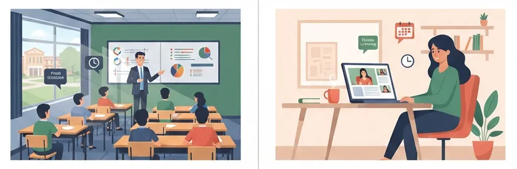 | Schedule | Fixed Hours | Flexible/Self-paced |