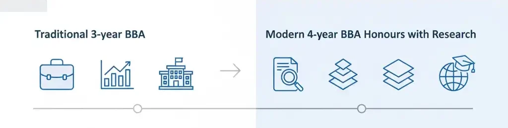 Historically, the Indian higher education system followed a strict three-year format for undergraduate degrees like BBA. Recently, the government introduced the four-year undergraduate program (FYUP) to align with global standards.