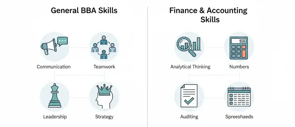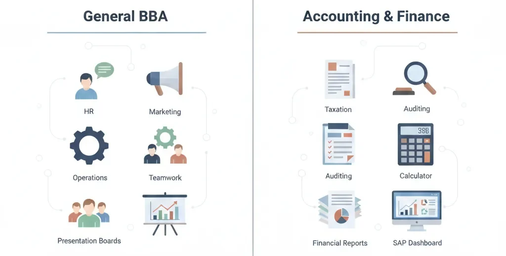 The difference between BBA and BBA Finance and Accounting lies in the scope of study. A general BBA offers a bird's-eye view of how a company functions. You will study HR, marketing, and operations alongside basic finance. In contrast, a BBA in Finance and Accounting is a deep dive. It focuses on the "nitty-gritty" of numbers. You will master Tally, GST, and corporate laws. While a general BBA makes you a "jack of all trades," the specialized version makes you a master of the balance sheet.